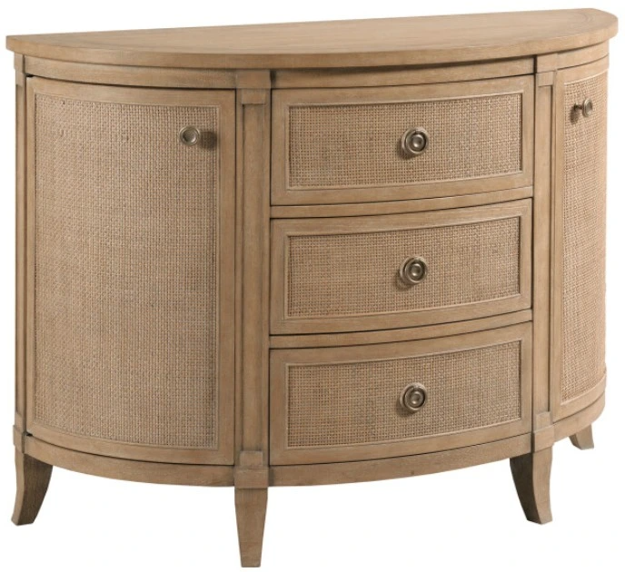 The American Drew® Chastain Woodfield Brown Demilune Chest offers a unique, half-moon design that combines style with function. Featuring spacious drawers, it provides ample storage while its elegant craftsmanship enhances the aesthetic of any room. Perfect for entryways or living spaces, it blends practicality with sophistication.Read More