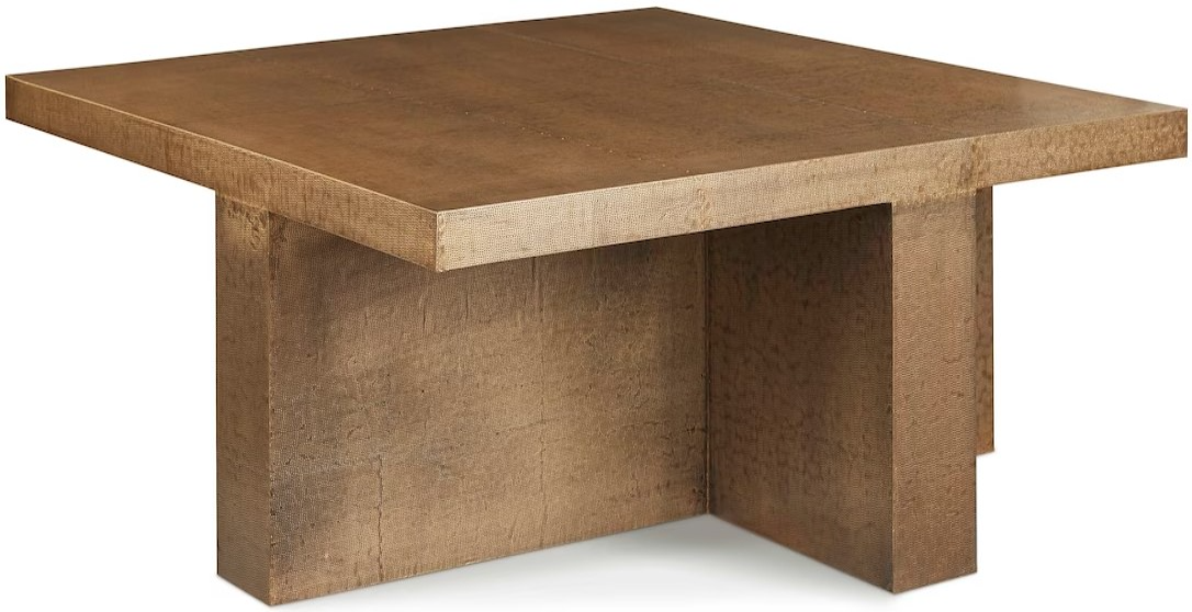 The Vansant cocktail table with a sleek, structure-like design with a rough-hewn finish adds a modern classic style to any space. It features asymmetrical legs and classic shapes and is covered in copper and zinc alloy cladding, powder coated in a brass finish.Read More