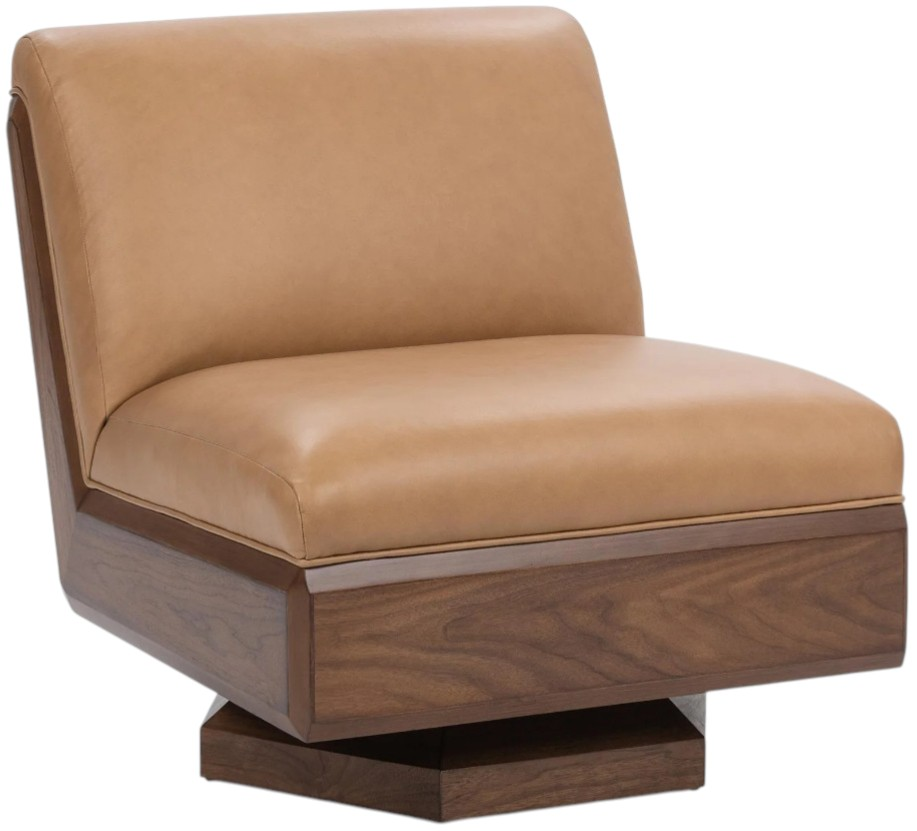 Elevate your living space with this modern swivel accent chair, expertly crafted from rich walnut wood and upholstered in luxurious top grain leather for a premium look and feel. The sleek, angular frame and low-profile silhouette make a bold statement in any room.Read More