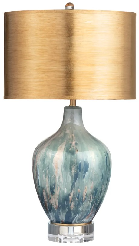 Add elegance to your space with this table lamp, showcasing a swirled grey glass body and hand-painted gold paper drum shade. A crystal base ensures stability, while its 150-watt, three-way bulb capacity offers versatile lighting. Golden accents elevate its sophisticated charmRead More