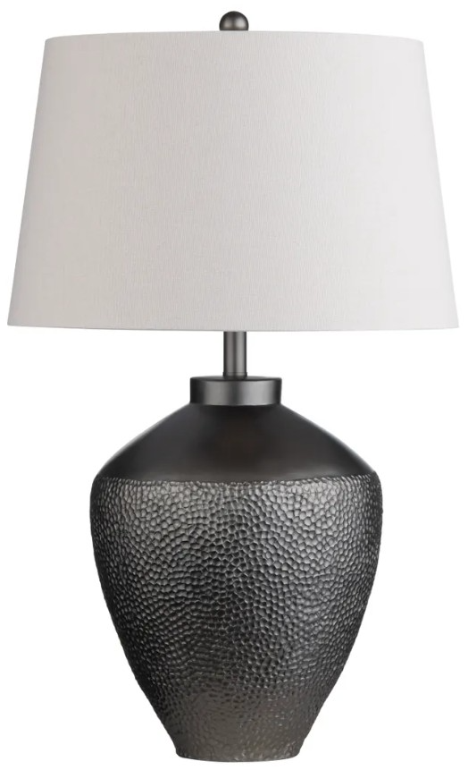 Enhance your space with the textured urn table lamp, crafted from resin and metal with a hammered gray finish for modern appeal. It features a tapered oatmeal linen shade and supports a 150-watt, three-way bulb. A clear 6-ft cord adds to its clean, sophisticated look.Read More