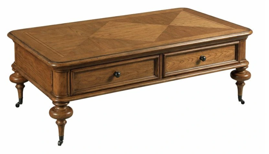 The Pearson rectangular coffee table is crafted of hardwood solids with a beautiful diamond cut hickory veneer patterned top. This piece offers a traditional style yet casual feel for any living space. It has two drawers for ample storage space. It also has removeable caster for easy mobility.Read More