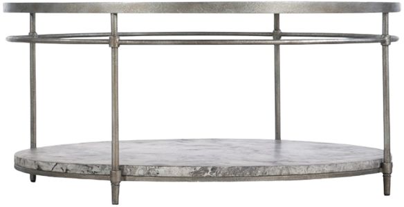 Beautifully scaled and intricately designed, this stunning round cocktail table pairs a champagne-colored metal frame with a glass top and concrete bottom with a soft gray and black pattern. Give your home a shot of style with our living room furniture. Make this room the perfect spot for conversation, entertaining, or just relaxing.Read More