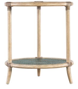 Inspired by tropical getaways, the Retreat raffia end table is a mixture of organic materials in a laid-back and versatile design. The table combines maple veneers, raffia, rope and tempered glass, with a painted raffia top and bottom shelf in a seagrass green finish, a glass-top insert and rope accents.Read More