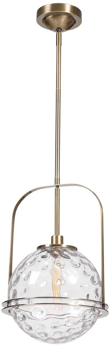 Soft contemporary lines anchor this oversized floating sphere of clear watered glass enhanced with rich antique brass accents giving a nod to modern design lines also. With 1-40 watt max, Edison socket and includes 1-40 watt clear T30 bulb. Supplied with 15' wire, 3-12" stems and 1-6" stem for adjustable installation.Read More