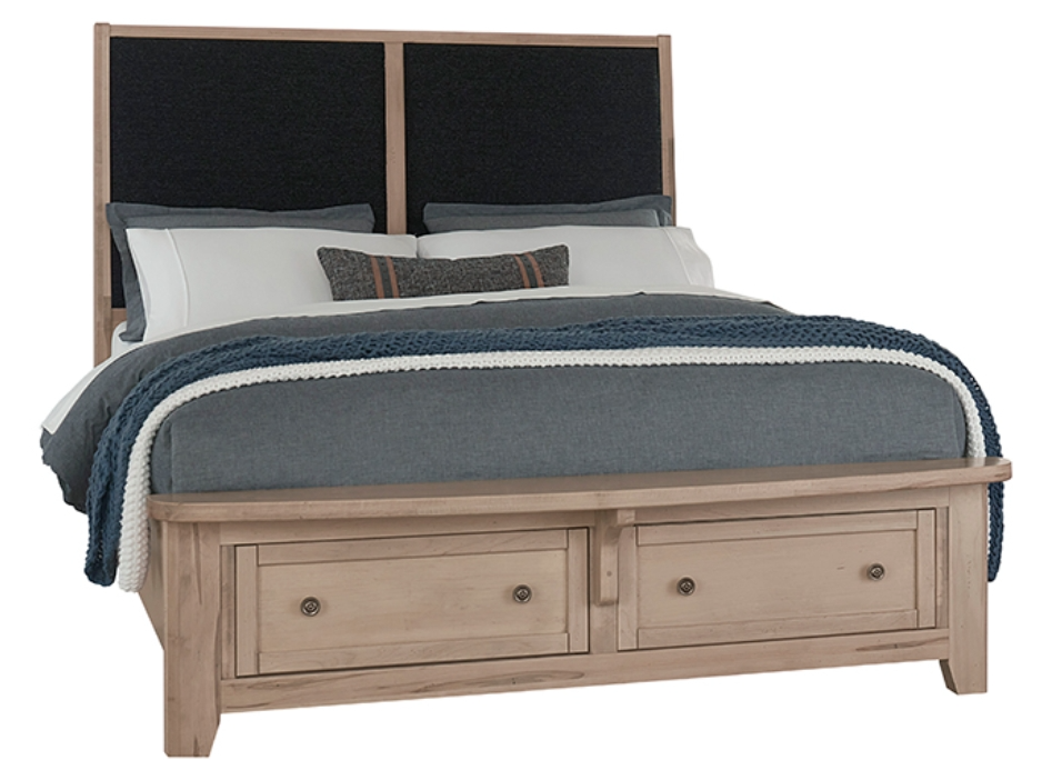 Upholstered bed with footboard storage boast a refined classic look that will stand the test of time. Styled with simple lines; the canted headboard is slightly angled for comfort. Two drawers in the footboard of the bed offer up plenty of convenient storage for extra bedding.Read More