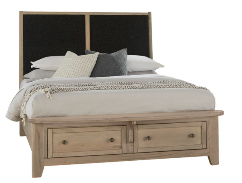 Upholstered bed with footboard storage boast a refined classic look that will stand the test of time. Styled with simple lines; the canted headboard is slightly angled for comfort. Two drawers in the footboard of the bed offer up plenty of convenient storage for extra bedding.Read More
